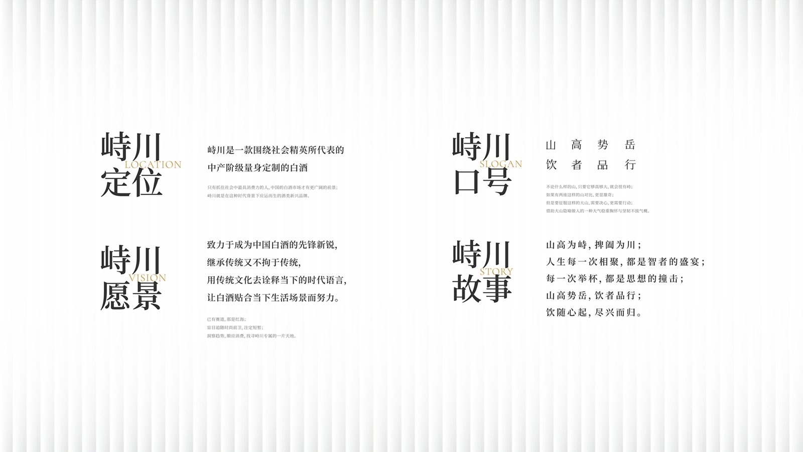 峙川,是针对中产阶级量身定制的现代文化白酒品牌,致力于成为中国白酒的先锋新锐,继承传统又不拘于传统,用传统文化诠释当下的时代语言;顺势而为,与时俱进,让白酒更贴合现代生活的应用场景。只有抓住社会中最具消费力的人,中国的白酒市场才有更广阔的前景,峙川就是在这种时代背景下应运而生的酒类新兴品牌。